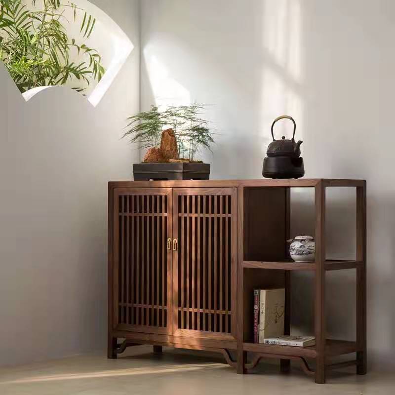 產品風格: 新中式產品型號: HJ-CSG-091產品主材: 黑胡桃木/老榆木產品尺寸: L900mm x W 360mm x H 800mm (可定制)