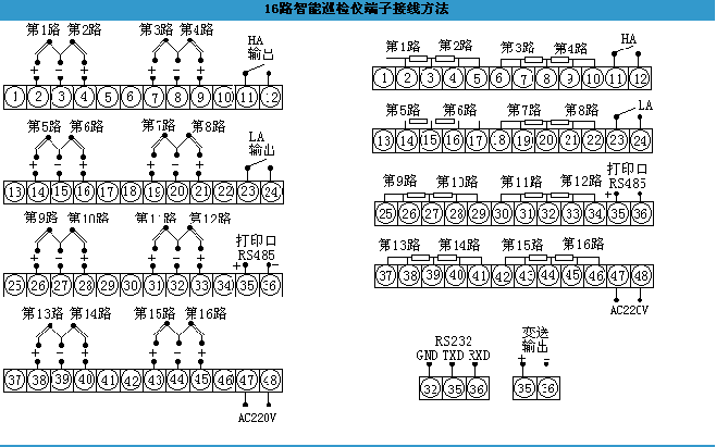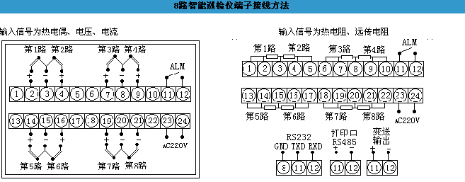 警報(bào)輸出: ⑴1-64通道統(tǒng)一上下限警報(bào),繼電器輸出觸點(diǎn)容量 AC220V/3A