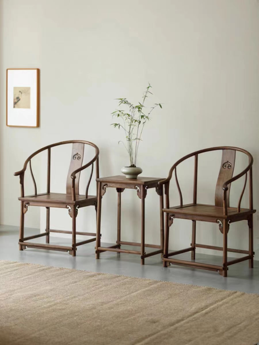 產品風格: 新中式產品型號: xxy-68956產品主材: 北方老榆木/北美進口FAS級黑胡桃木產品尺寸: 椅子:L600mm x W 480mm x H990mm,茶幾L480xW380xH690cm