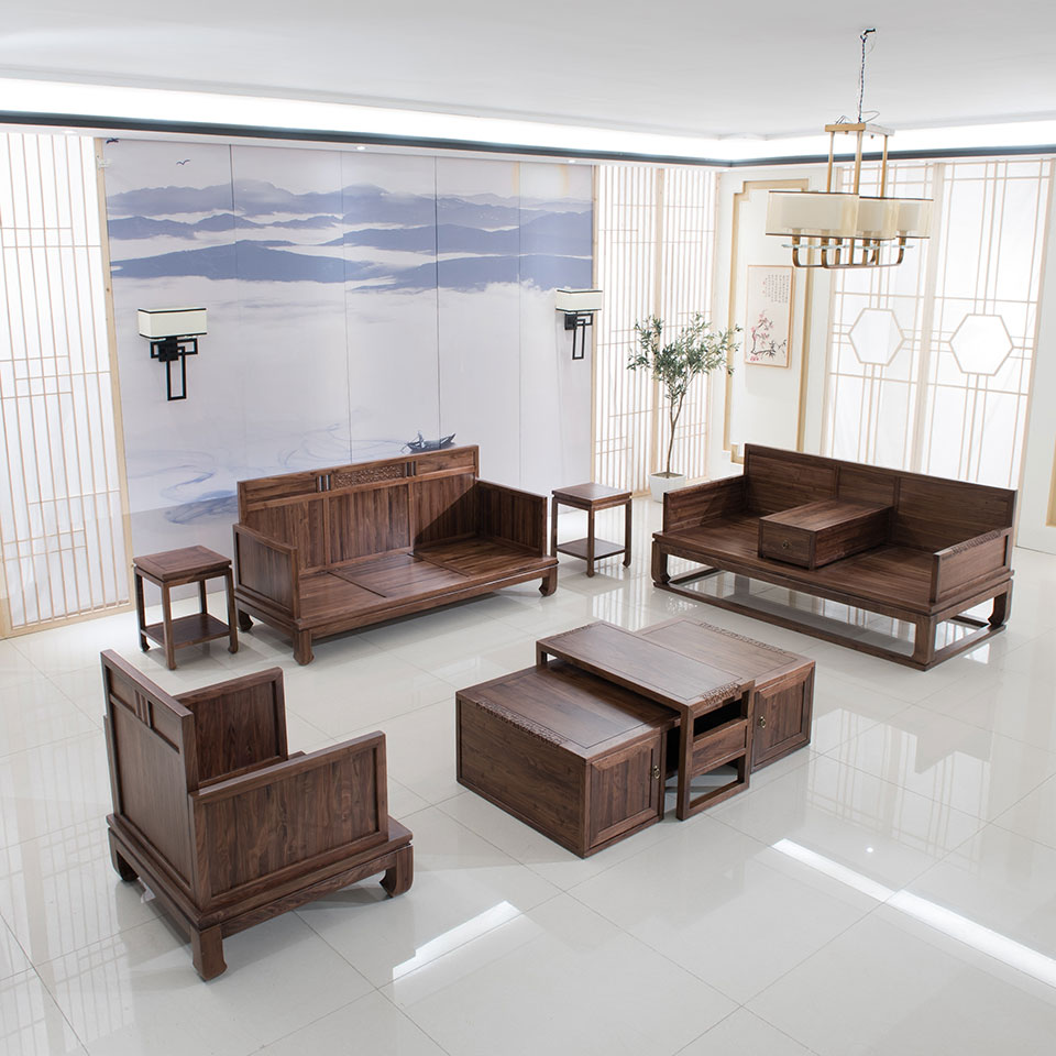 產品風格: 新中式產品型號: SF-010產品主材: 北方落梁老榆木/北美進口黑胡桃木產品尺寸: 三人位:200x80x96cm ,雙人位:165x80x96cm,單人位:80x80x96cm,茶幾:150x80x42cm,活動茶幾:95x42x50cm,角幾:45x45x55cm