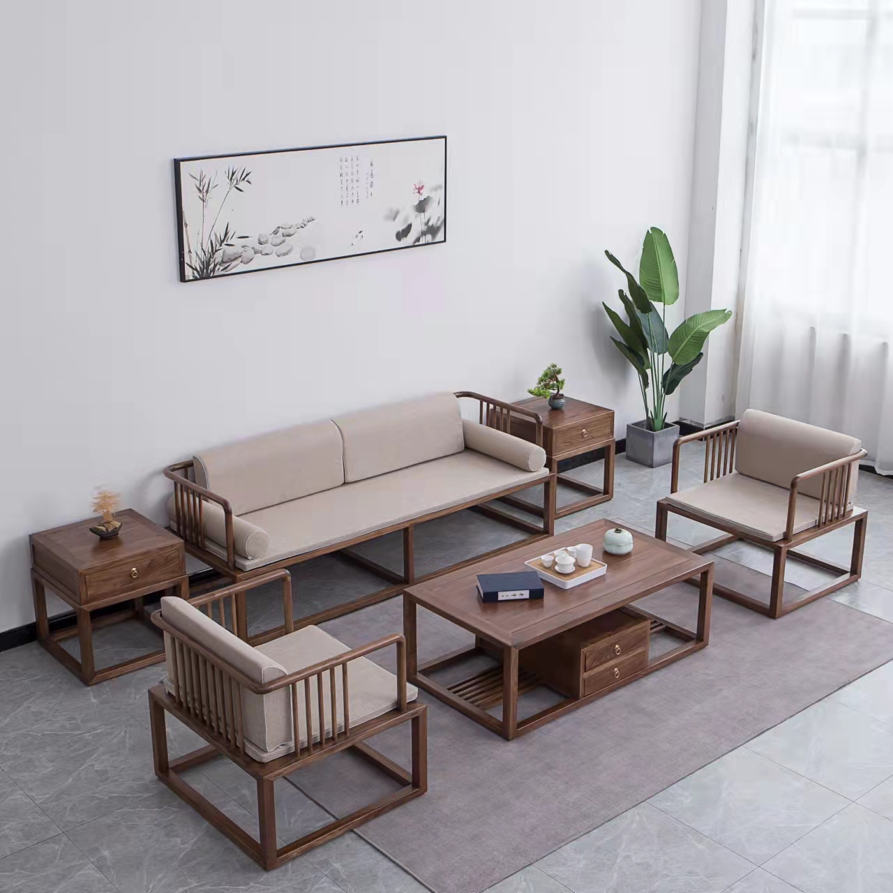 產品風格: 新中式產品型號: HJ-SF-028產品主材: 黑胡桃木/老榆木產品尺寸: 3人沙發 L800mm x W750mm x H 740mm ;單人位: L2100mm x W750mm x H 740mm (可定制)