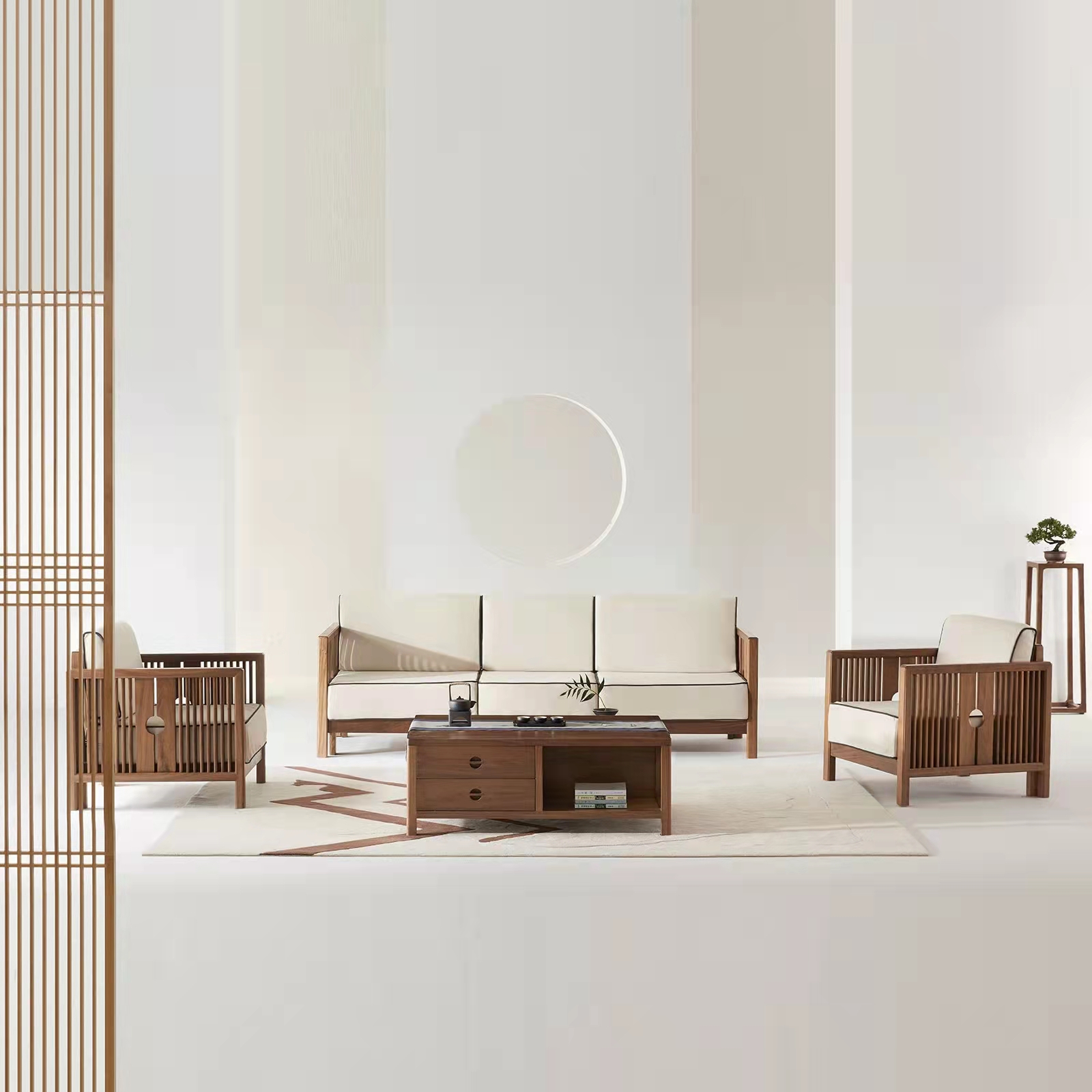 產品風格: 新中式產品型號: SF--61產品主材: 北美進口白蠟木 / 北美進口黑胡桃木產品尺寸: 3人位 L 208 x W 80 x H75CM ,單人位 L 98 x W 80 x H75 cm 茶幾 L 140 x W75 x H48 cm