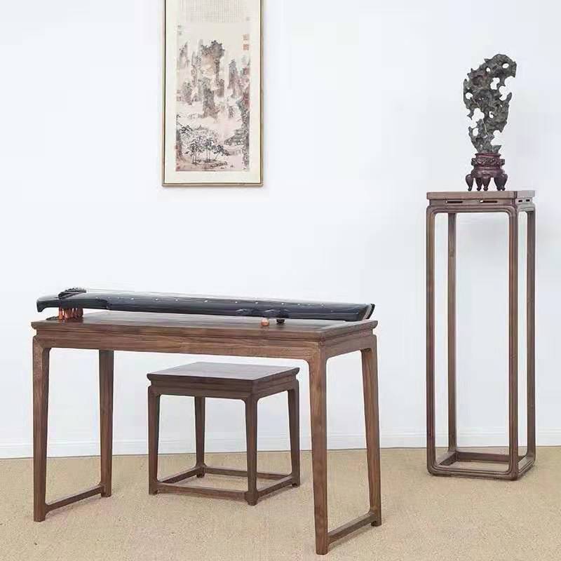 產品風格: 新中式產品型號: HJQD--0018產品主材: 北美進口黑胡桃木/北方落梁老榆木產品尺寸: 琴桌 L110cm x W 42cm x H 68cm / 琴凳 L 45cm x W 35cm x H 45cm (可定制)